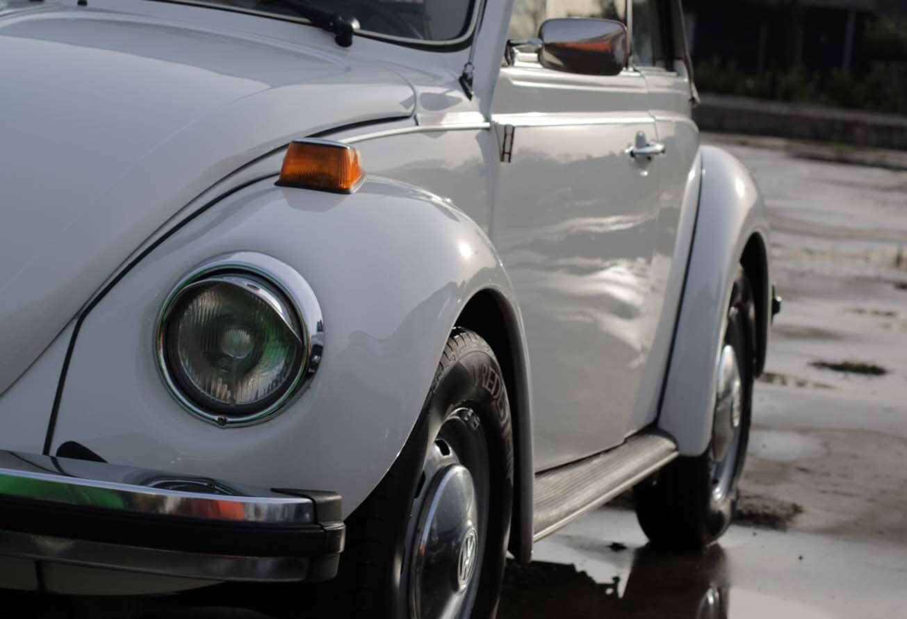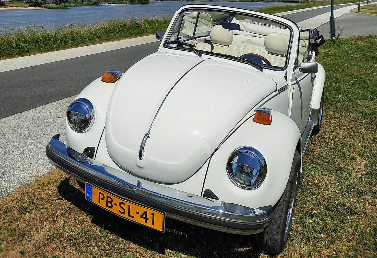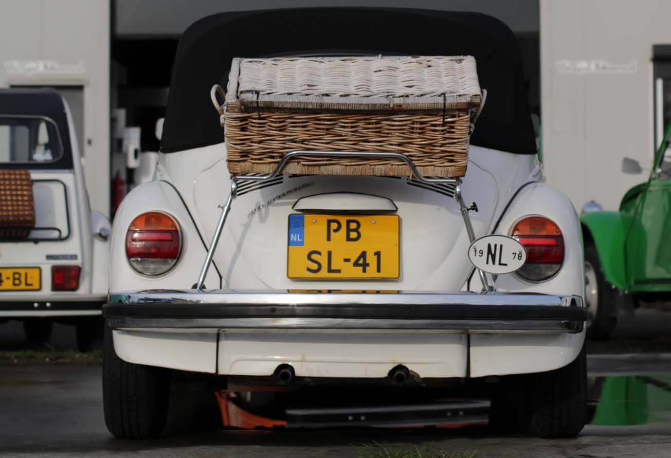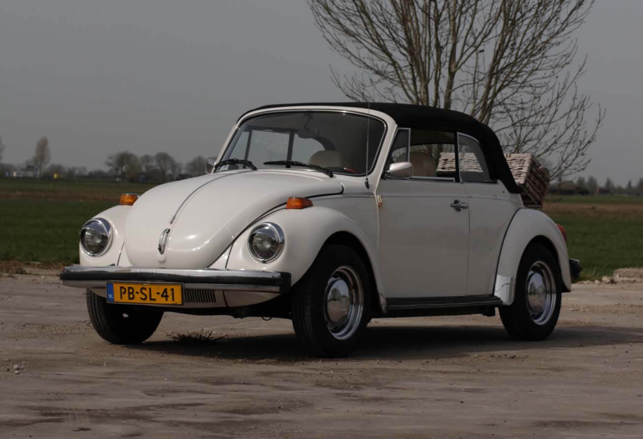 Maak kennis met Miss Black & White, onze Volkswagen Kever cabriolet met een stijlvol zwart cabriodak voor een mooi contrast. Het witte exterieur en interieur geven haar, net als Miss White, een tijdloze en elegante uitstraling.