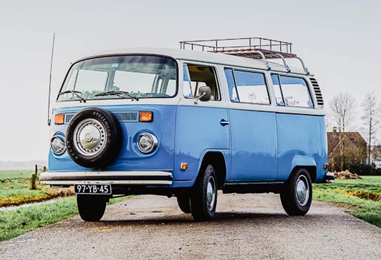 Onze donkerblauwe Volkswagen T2, bijgenaamd Seattle, is een stoer en karaktervol trouwbusje. Het opvallende reservewiel aan de voorkant geeft haar een unieke uitstraling en trekt overal de aandacht.