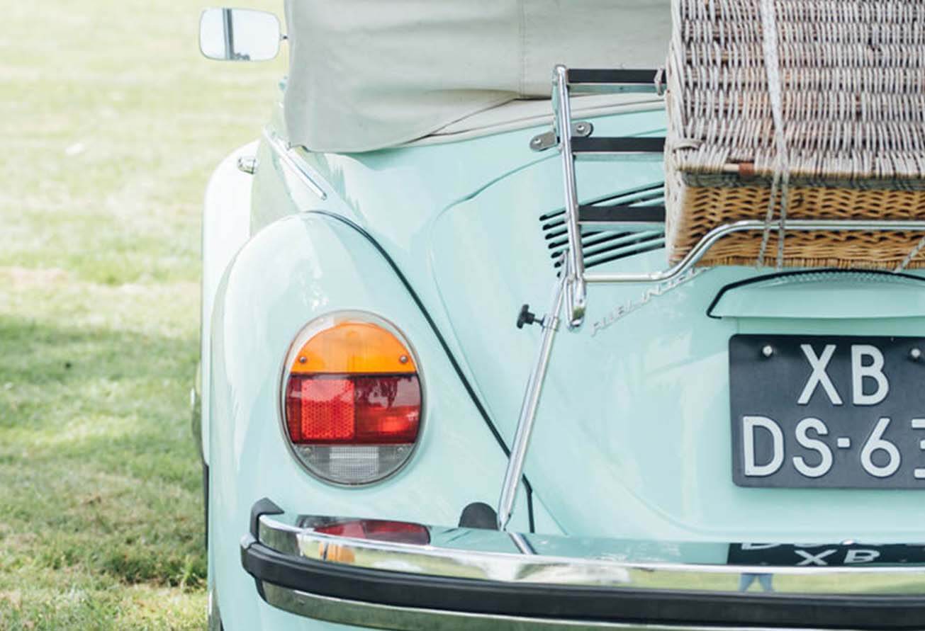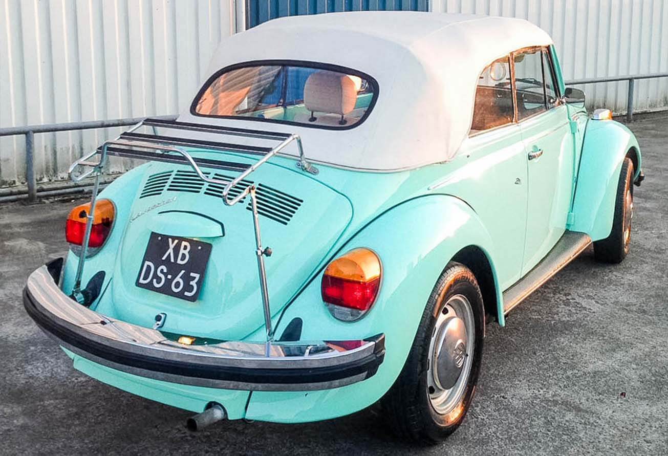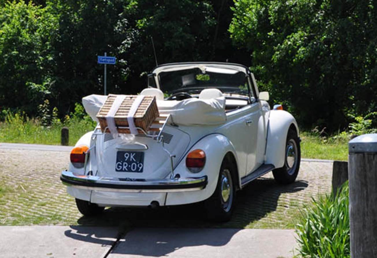 Naast onze mintgroene Kever cabriolet kun je bij ons ook kiezen voor Miss White, de stijlvolle Triple White. Deze volledig witte Kever cabrio, inclusief interieur en kap, is een jubileummodel uit de laatste productiejaren in Duitsland. Met haar elegante en tijdloze uitstraling is Miss White ideaal voor een romantische, klassieke bruiloft of een bijzondere rit vol charme.